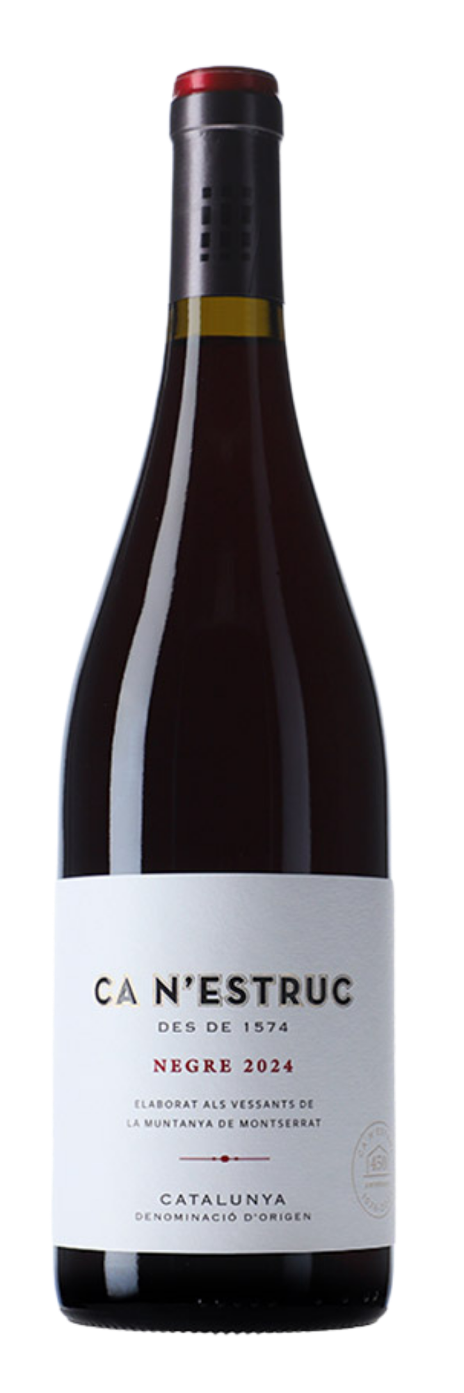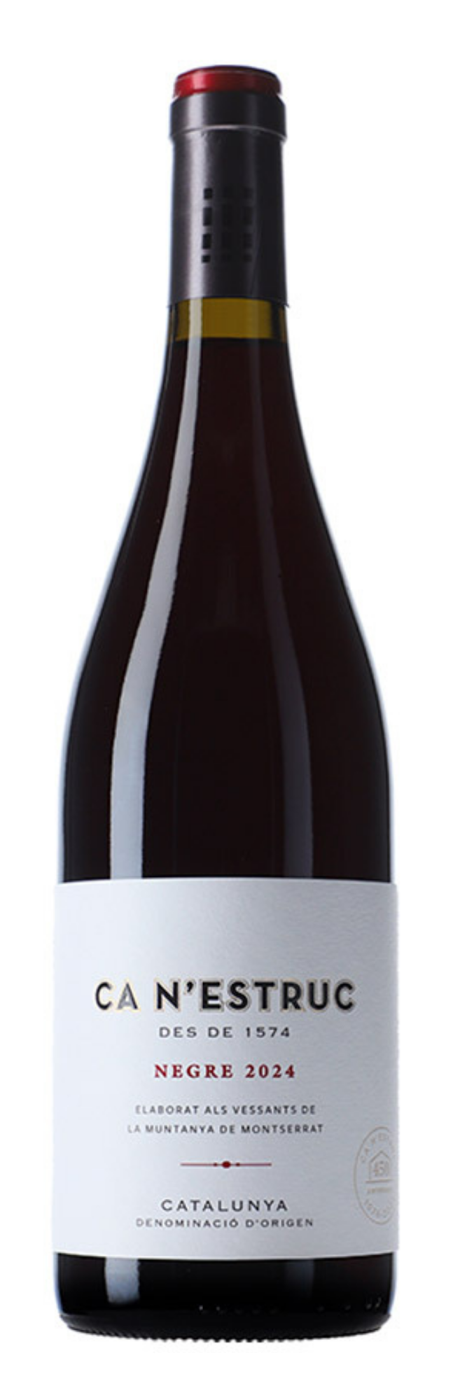 Ca N’Estruc Negre 2024 is a youthful, fruit-forward red built primarily on Garnacha, supported by Samsó (Carignan), Syrah, and a small proportion of Petit Verdot. The blend combines estate fruit with grapes from supervised vineyards in the same area, reflecting the broader terroir of the Montserrat foothills.